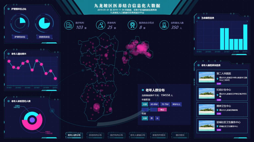 养老产业的智慧化升级已经成为我国应对人口老龄化过快增长的必然趋势。建设“九龙坡区卫健委医养结合信息化系统”,是贯彻《重庆市以大数据智能化为引领的创新驱动开展战略行动计划(2018—2020年)》文件精神,落实智慧养老建设要求的具体举措。顺利获得构建医养结合管理子系统,全面分析以及监督九龙坡全区医养结合建设情况,为老年人给予“医养结合、以养为主”为核心的健康养老专业服务,包括持续的日常保健、健康促进、中医康复、养老护理、其他生活便利服务,以及个性化的专业定制服务,利用大数据智能化技术赋能,提高服务精准度,为重庆养老产业赋能、为重庆老人生活添彩。同时,有效挖掘医养数据内在价值,实现管理者对于医养结合运行状态和潜在问题的“先知、先觉和先行”,打造全国大数据、云应用示范标杆。